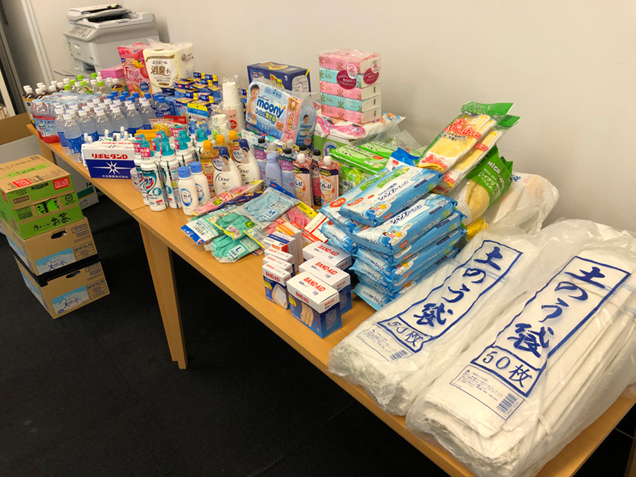 土のう袋、飲料水(ミネラルウォーター、お茶など)、軍手、日用品(ティッシュペーパー、トイレットペーパー、紙コップ、紙皿、シャンプー、洗濯用洗剤など)、衛生用品(絆創膏、除菌シートなど)、食料品(缶詰、レトルト食品、栄養調整食品など)